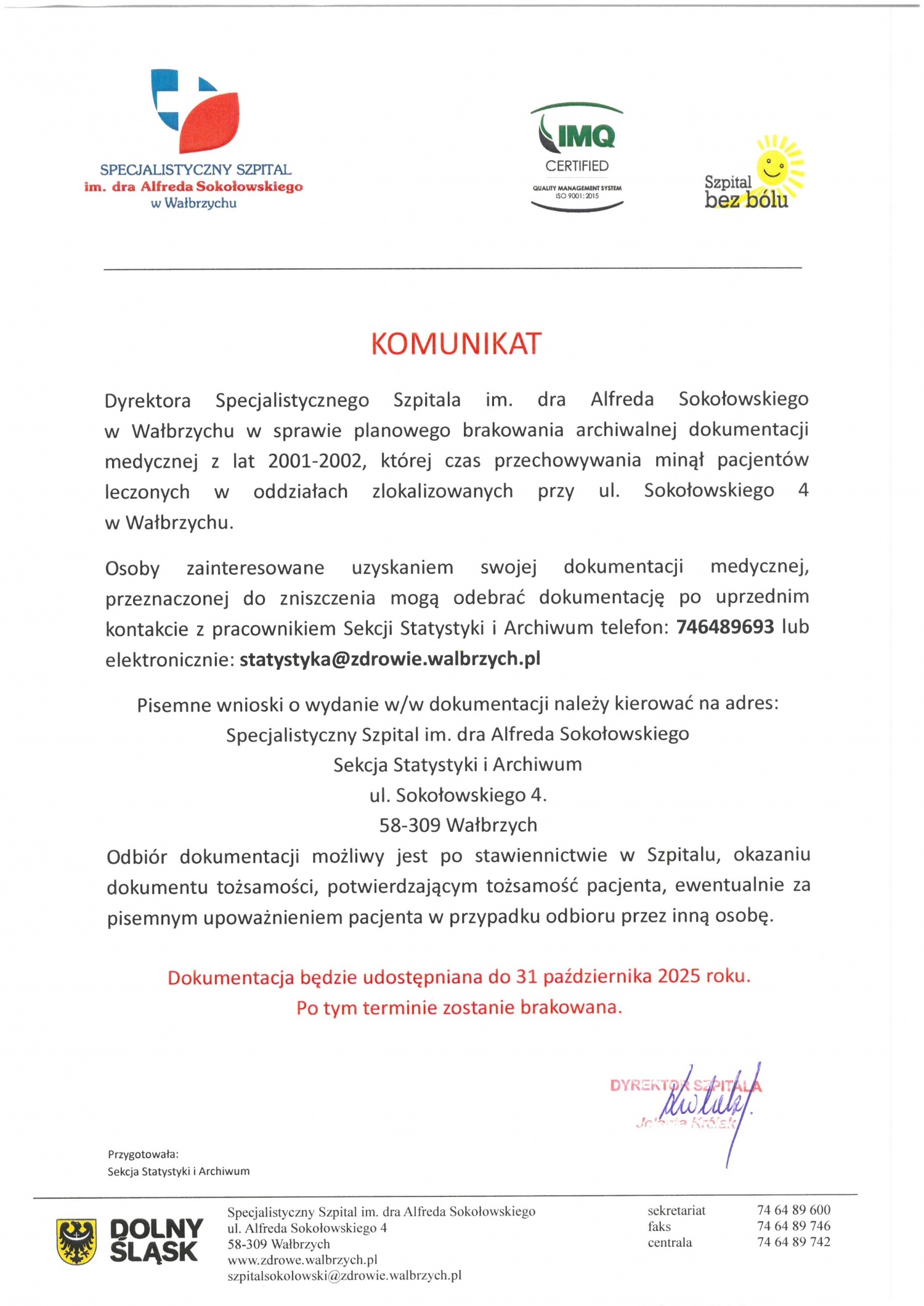 Komunikat w sprawie odbioru depozytów pozostawionych w szpitalu w latach 2013-2023.