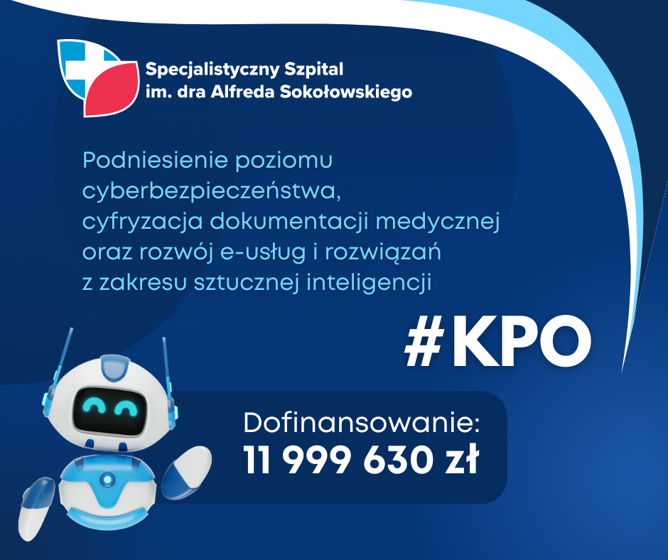 Szpital uzyska wsparcie z Ministerstwa Zdrowia w ramach inwestycji D1.1.2 „Przyspieszenie procesów transformacji cyfrowej ochrony zdrowia poprzez dalszy rozwój usług cyfrowych w ochronie zdrowia” (nabór konkurencyjny – numer naboru: KPOD.07.03-IP.10-001/25) Krajowego Planu Odbudowy i Zwiększania Odporności (KPO).