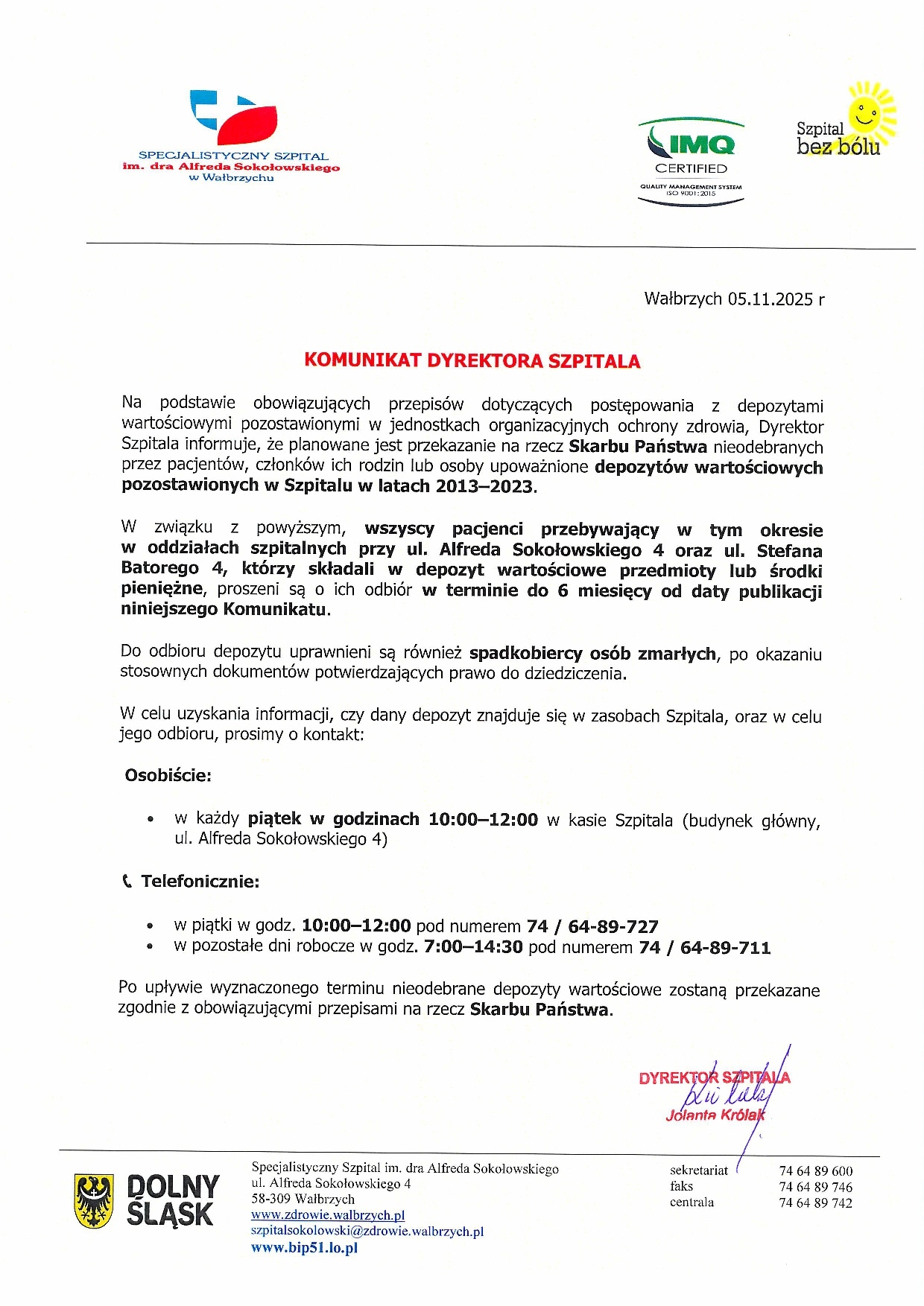 Komunikat w sprawie odbioru depozytów pozostawionych w szpitalu w latach 2013-2023.