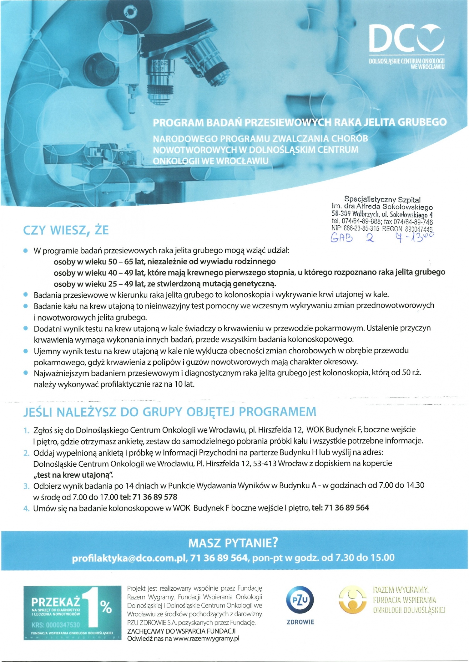 Zapraszamy do wzięcia udziału w programie badań przesiewowych raka jelita grubego finansowanego w ramach narodowego programu zwalczania chorób nowotworowych polegającego na wykrywaniu krwi utajonej w kale.