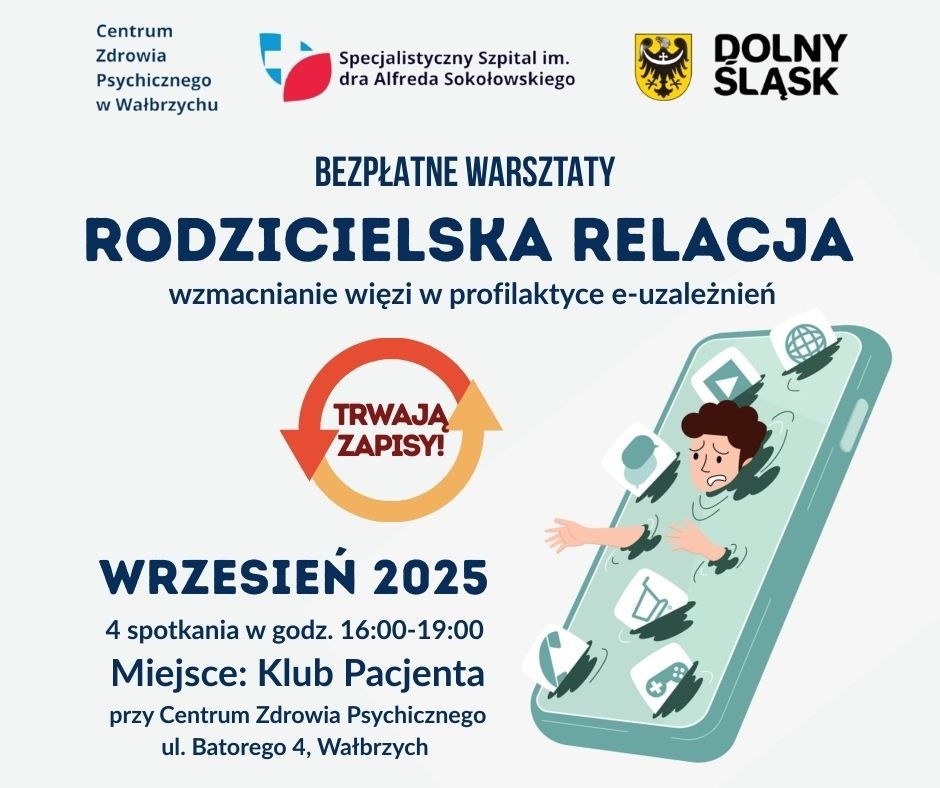 Centrum Zdrowia Psychicznego działające przy Specjalistycznym Szpitalu im. dra A. Sokołowskiego w Wałbrzychu zaprasza na BEZPŁATNE WARSZTATY „Rodzicielska relacja - wzmacnianie więzi w profilaktyce e-uzależnień”.