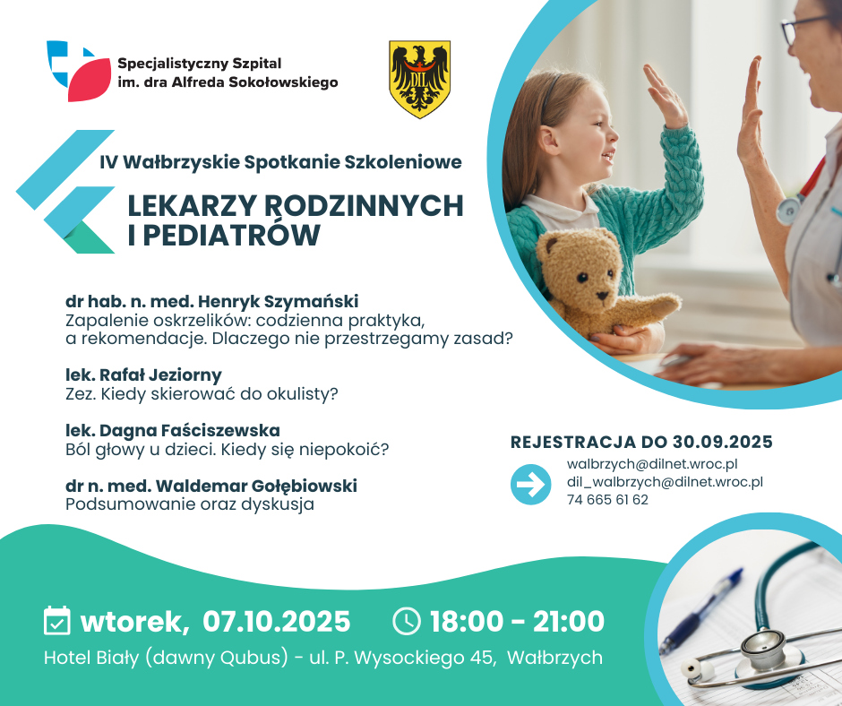 Wspólnie z Dolnośląską Izbą Lekarską zapraszamy na IV Wałbrzyskie Spotkanie Szkoleniowe Lekarzy Rodzinnych i Pediatrów, które odbędzie się we wtorek, 7 października 2025 r., w godz. 18:00 - 21:00, w Hotelu Biały (dawny Qubus) w Wałbrzychu przy ul. P. Wysockiego 45.