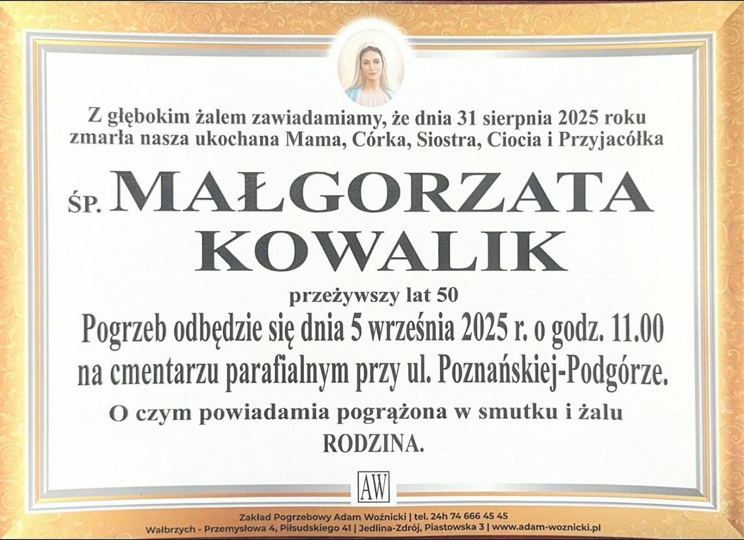 Z głębokim smutkiem przyjęliśmy wiadomość o odejściu naszej bliskiej Koleżanki, Małgorzaty Kowalik. Ta strata jest dla nas ogromnym ciosem, w sercach zostawia pustkę i wciąż budzi niedowierzanie.