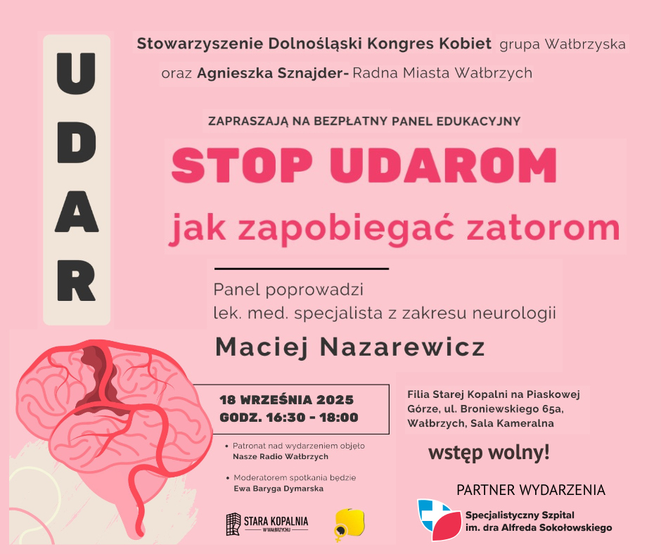 Miło nam poinformować, że Specjalistyczny Szpital im. dra A. Sokołowskiego w Wałbrzychu został partnerem wydarzenia „STOP UDAROM. Jak zapobiegać zatorom”, którego organizatorami są Stowarzyszenie Dolnośląski Kongres Kobiet grupa Wałbrzyska oraz Agnieszka Sznajder - Radna Miasta Wałbrzych