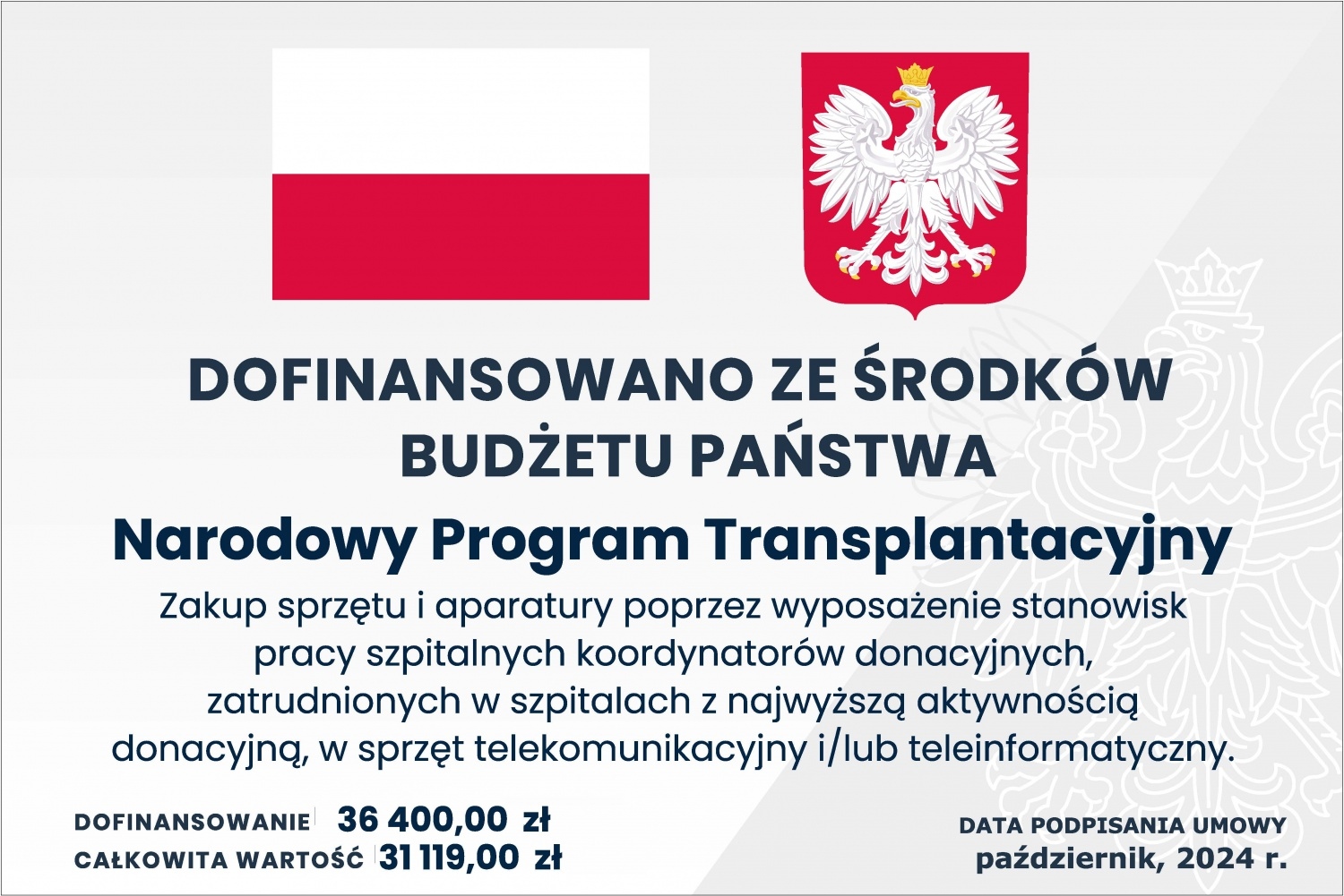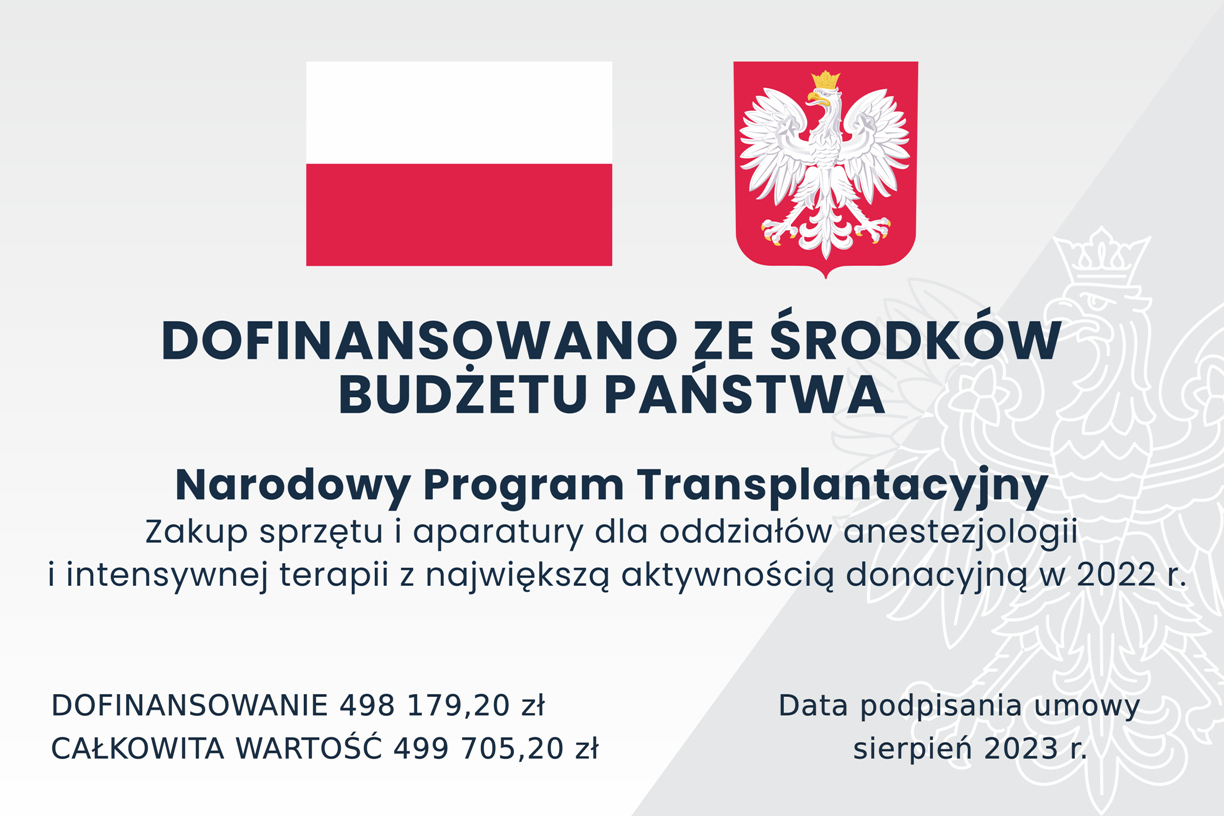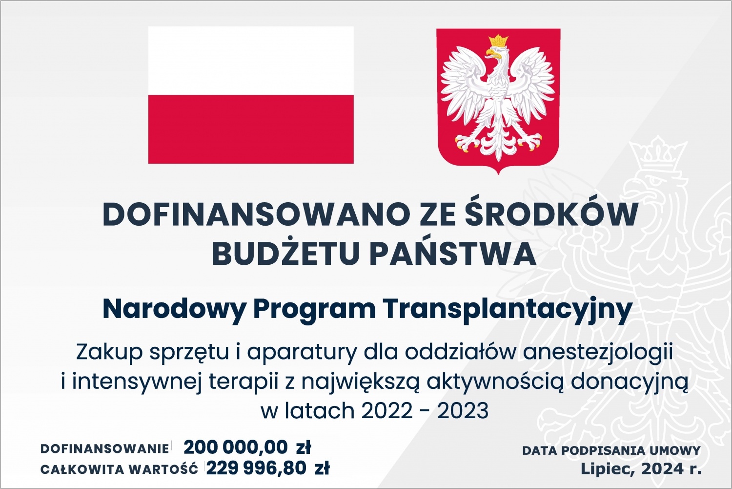 Projekt finansowany ze środków budżetu Państwa przez Ministerstwo Zdrowia na realizację w roku 2024 r. zadania: ,,zakup sprzętu i aparatury” w ramach Narodowego Programu Transplantacyjnego poprzez zakup sprzętu i aparatury dla oddziałów anestezjologii i intensywnej terapii z największą aktywnością donacyjną w latach 2022-2023.