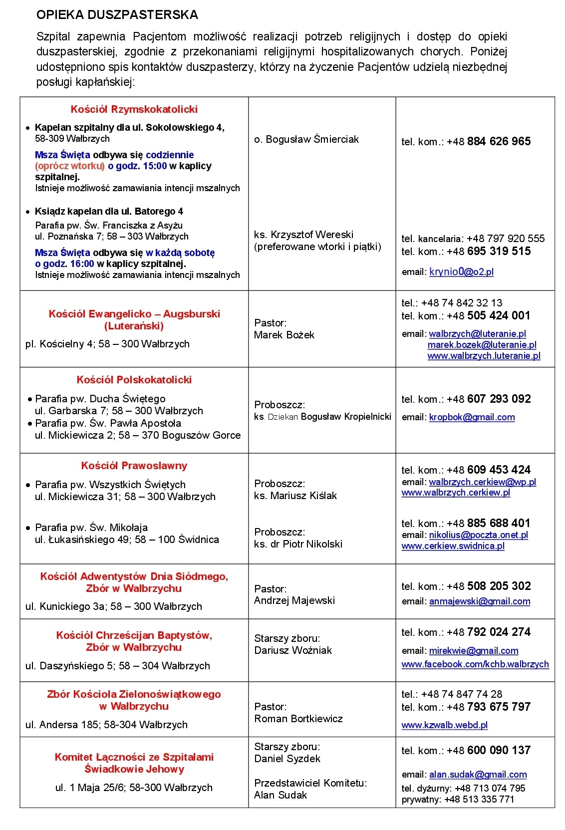 Poniżej udostępniono spis kontaktów duszpasterzy, którzy na życzenie Pacjentów udzielą niezbędnej posługi kapłańskiej.